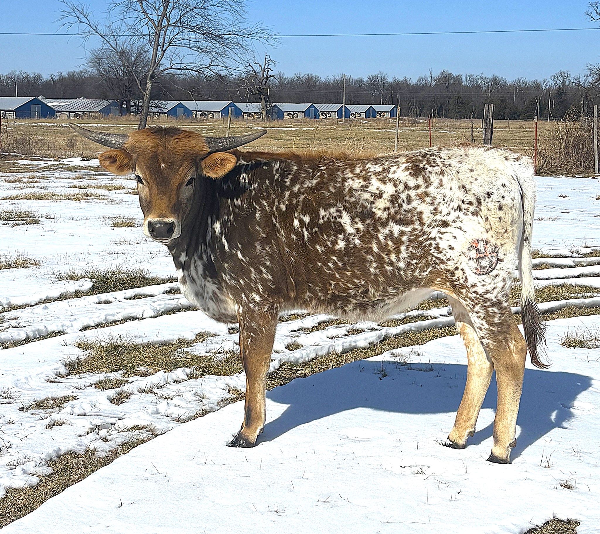 This beautiful heifer is one of the flashiest calves born on our farm. She is sure to be a competitor in the show ring. Her sire continues to leave his distinct color pattern on his calves and knocked it out of the park with this one.